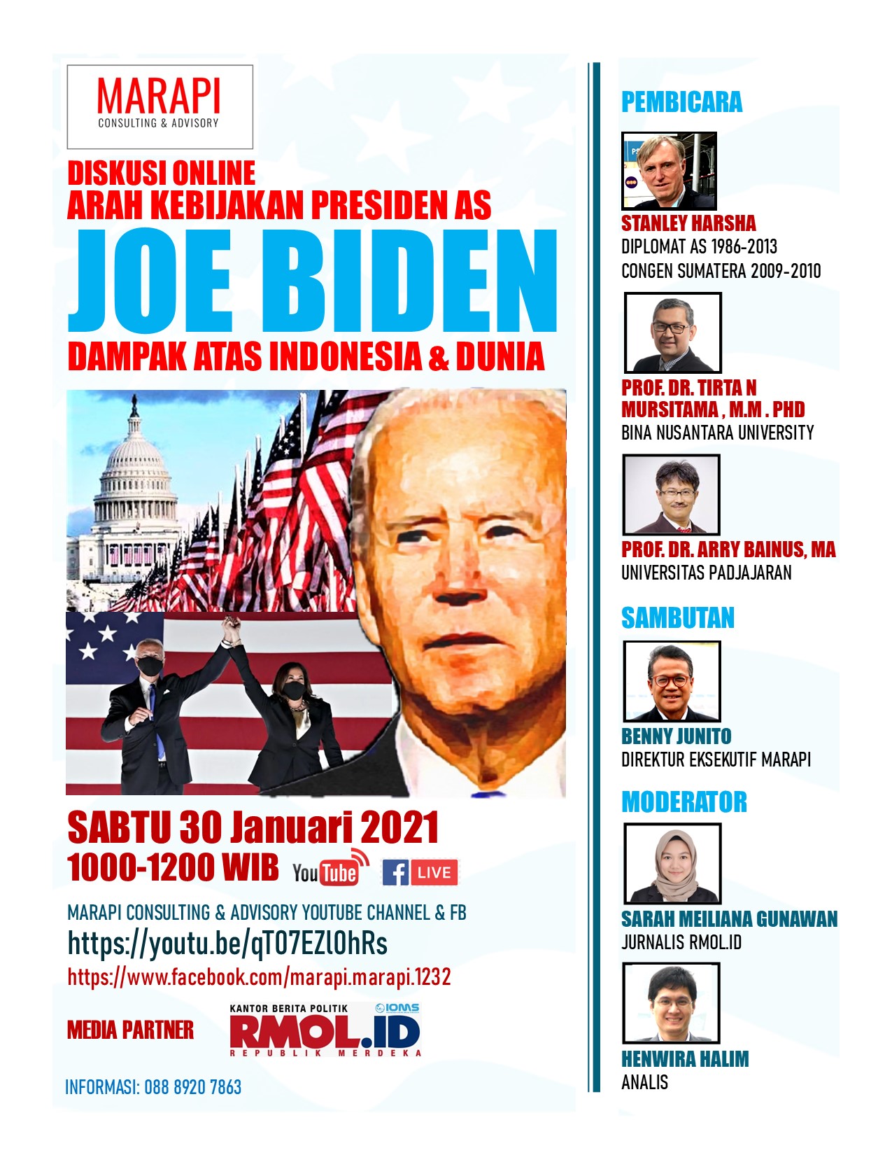 Salah satu dampak positif dari terpilihnya Presiden baru Amerika Serikat (AS) Joe Biden adalah “Indonesia mempunyai peluang dalam Kerjasama Kesehatan global, terutama penangulangan Covid-19 dengan AS, sehingga diplomasi kesehatan dan diplomasi vaksin harus ditingkatkan mengingat angka infeksi dan kematian di AS dan Indonesia tinggi, sehingga Indonesia mempunyai peluang untuk memenuhi kebutuhan alat-alat Kesehatan dan vaksinasi secara bersama-sama terutama [untuk produk AS] Pfizer-Biotech.” Demikian yang disampaikan oleh Prof. Dr. Arry Bainus MA., Guru Besar Hubungan Internasional Universitas Padjajaran dalam webinar mengenai “Arah Kebijakan Presiden AS Joe Biden, Dampak Atas Indonesia dan Dunia yang diselenggarakan oleh Marapi Consulting & Advisory, Sabtu (30/01/2021).
