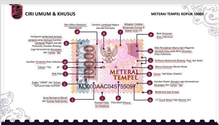 angka “10000” dan tulisan “SEPULUH RIBU RUPIAH” yang menunjukkan tarif bea meterai, teks mikro modulasi “INDONESIA”, blok ornamen khas Indonesia, dan seterusnya.