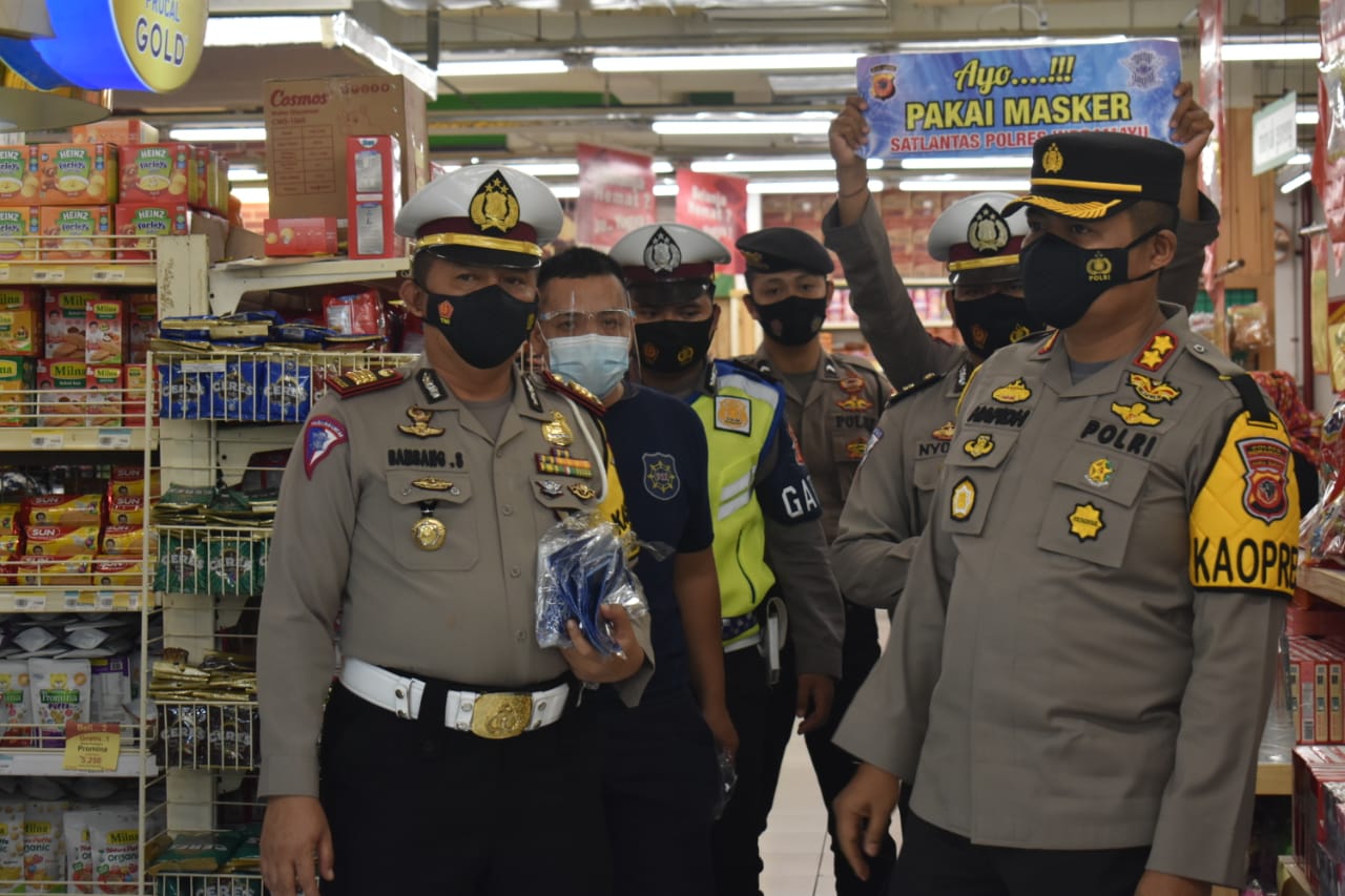 Selain membagikan masker, di waktu yang sama Kapolres beserta jajaran juga menegur masyarakat yang tidak menggunakan Masker.