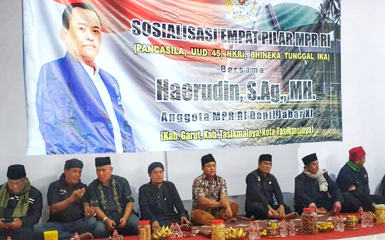 KAB. GARUT, – Bersama Yayasan Duha, anggota Majelis Permusyawaratan Perwakilan Rakyat (MPR) Republik Indonesia, dari Fraksi Partai Amanat Nasional (PAN), M. Hoerudin Amin menggelar Sosialisasi Empat Pilar Kebangsaan yang digelar di Aula Pesantren Cikuya Desa Bojong Kidul Kecamatan Pameungpeuk Kabupaten Garut, Kamis 2 Juni 2022.