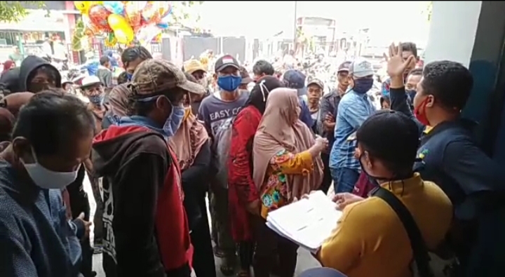KARAWANG – Camat Jayakerta, Budiman, membagikan masker kepada warga yang antri untuk menerima uang tunai bantuan sosial Kabupaten Karawang sebesar Rp300 ribu, itu dilakukan camat setelah melihat masih banyak warga tidak pakai masker, mereka belum sadar bahaya Covid-19.