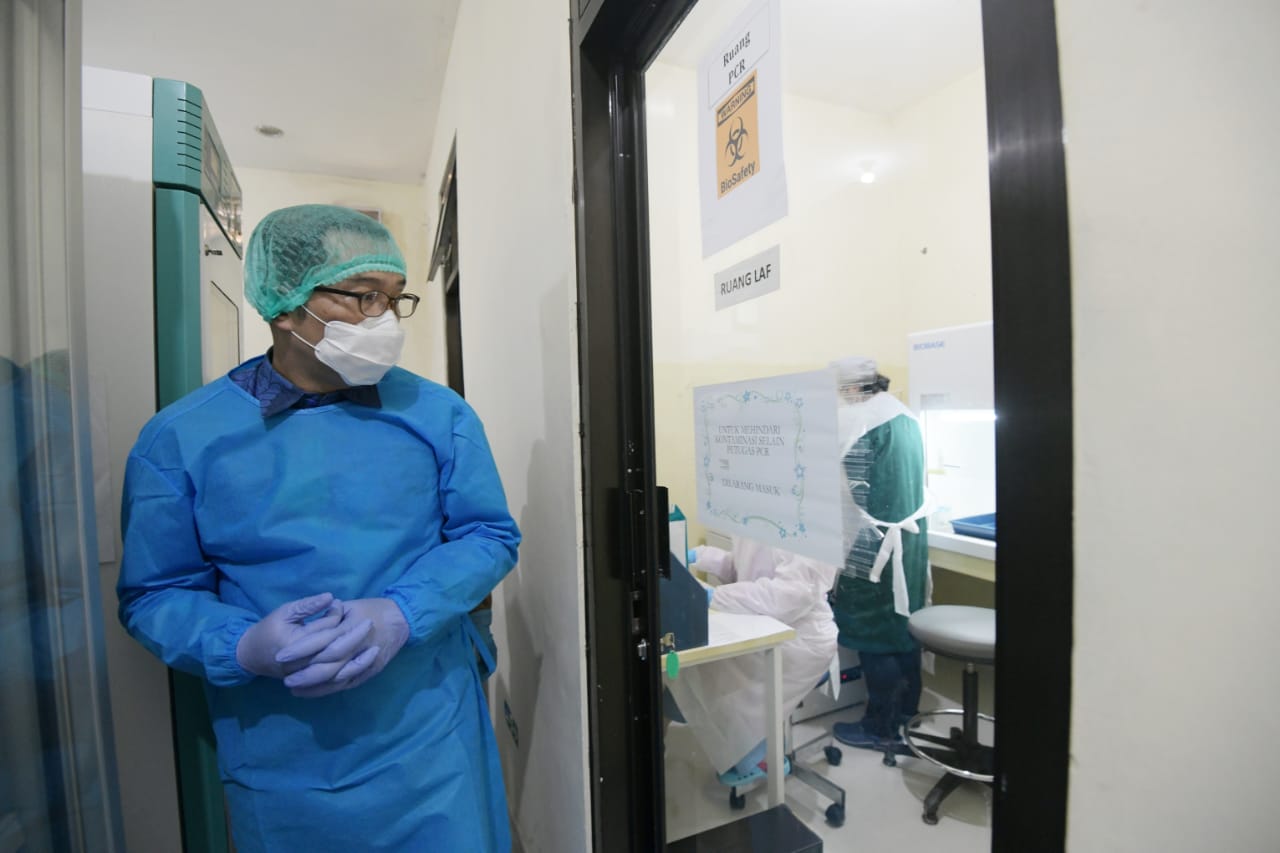 DEPOK, — Gubernur Jawa Barat (Jabar) Ridwan Kamil yang juga Ketua Gugus Tugas Percepatan Penanggulangan Covid-19 Jabar meninjau fasilitas pelayanan kesehatan (fasyankes) di Laboratorium Kesehatan Daerah (Labkesda) Kota Depok dan Rumah Sakit (RS) Citra Medika Depok, Jumat (2/10/2020).