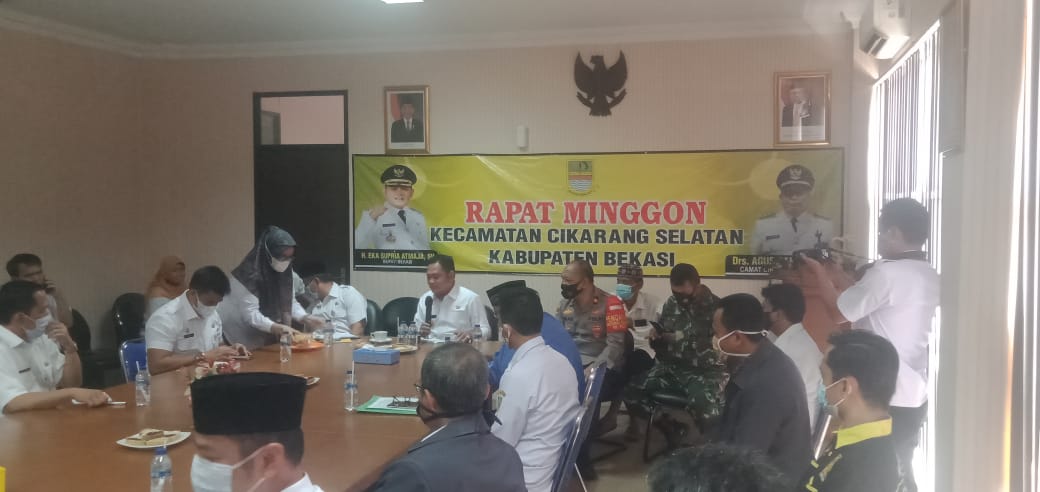 Sesaat sebelum meninjau lokasi program Bersekah, Bupati Bekasi mengikuti rapat Minggon di Kantor Camat Cikarang Selatan.