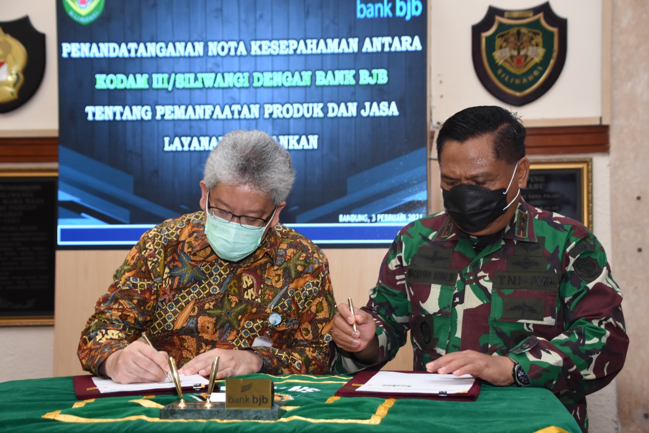 Bandung,- Kodam III/Siliwangi melaksanakan Penandatanganan Nota Kesepahaman (MoU) dengan PT. Bank Pembangunan Daerah (Bjb)) Jawa Barat dan Banten. Penandatanganan dilakukan oleh Pangdam III/Slw Mayjen TNI Nugroho Budi Wiryanto dan Direktur Utama PT. Bank Pembangunan Daerah Jawa Barat dan Banten Yuddy Renaldi di laksanakan di Ruang Siliwangi Jalan Aceh No. 69 Kota Bandung, Jabar, Rabu (3/2/2021).