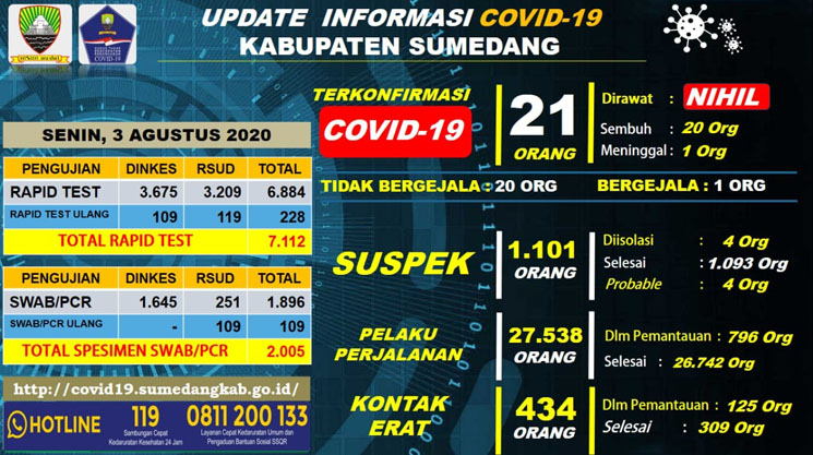 Demikian Siaran Pers Perkembangan Penyebaran Covid-19 di Kabupaten Sumedang pada hari ini Senin tanggal 3 Agustus 2020, kepada seluruh warga masyarakat Kabupaten sumedang diimbau agar tetap waspada pada masa AKB ini. Semoga Allah Subhanahu wata’ala selalu meridhoi segala upaya yang kita laksanakan. Abas-eljabar.com