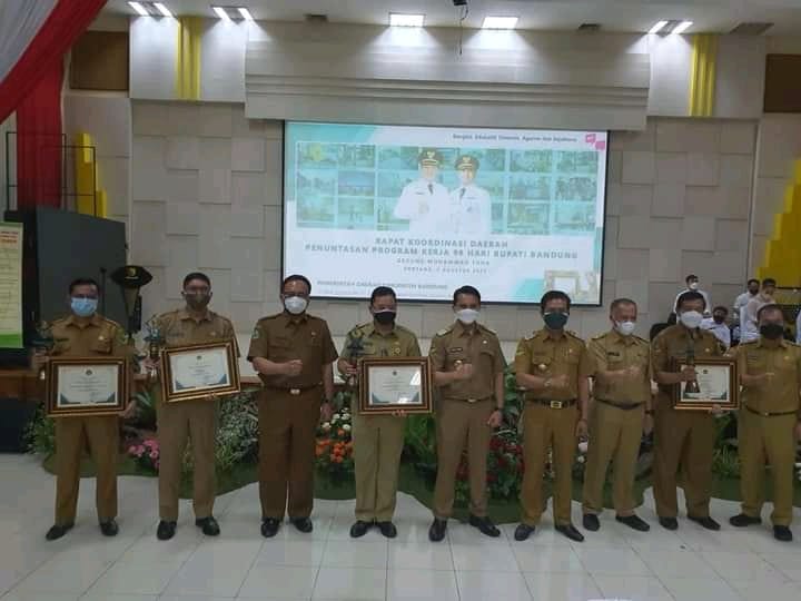 KAB. BANDUNG,- Disperkimtan Kab Bandung menerima penghargaan ke II saat Rapat Koordinasi Penuntasan Program Kerja 99 Hari Bupati Bandung, di Gedung Moch. Toha, Soreang, Kab. Bandung, Jawa Barat, Senin (2/8/2021).