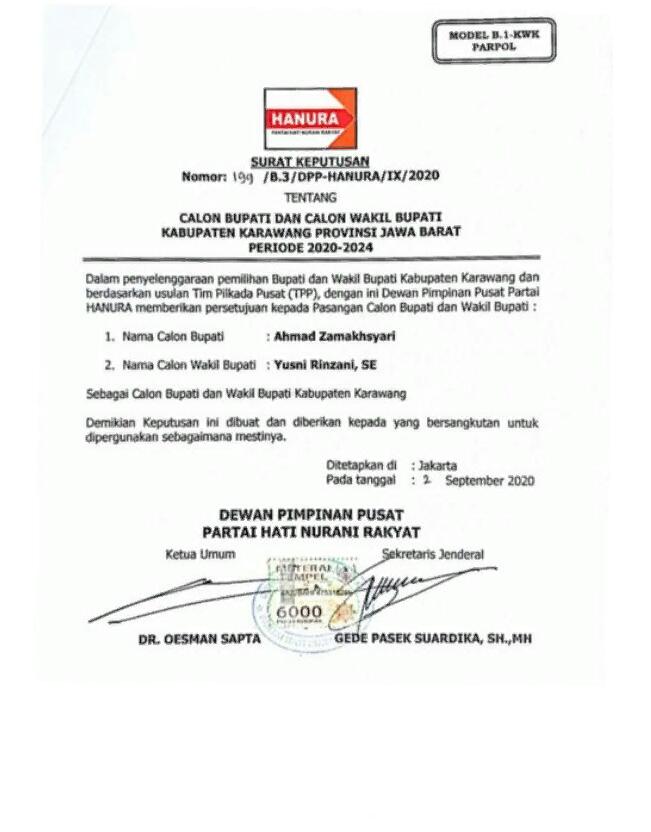 KARAWANG – Berdasarkan Surat Keputusan (SK) nomor: 199/B.3/DPP-Hanura/IX/2020 yang dikeluarkan pada 2 September 2020, parpol besutan Oesman Sapta akhirnya berlabuh mendukung pasangan Ahmad Zamakhsyari-Yusni Rinzani (Jimmy-Yusni) di Pilkada Karawang.