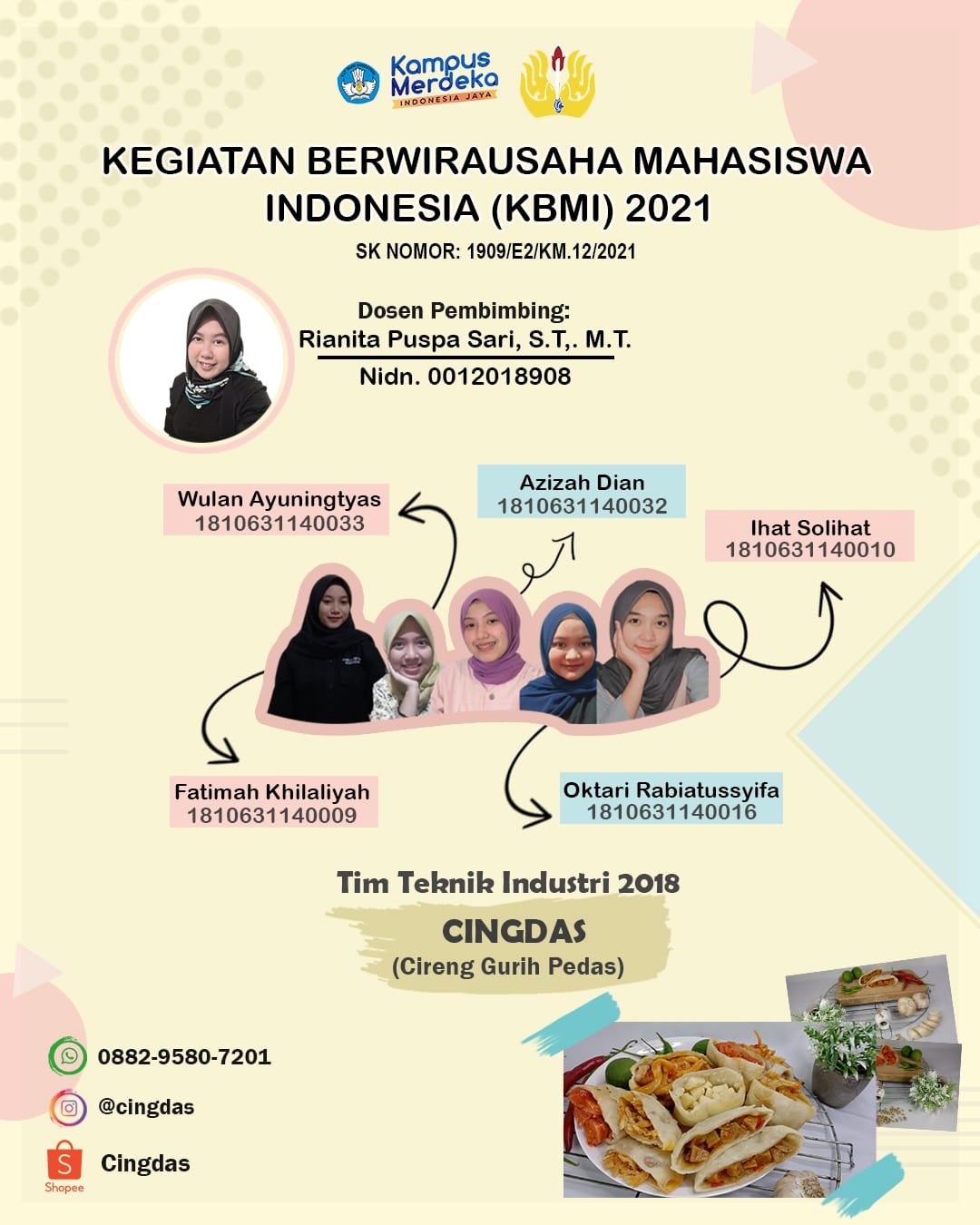 Salah satu dari 5 tim tersebut adalah tim Cireng Gurih Pedas (CINGDAS) dengan ketua tim Ihat Solihat mahasiswa Teknik Industri 2018 serta 4 anggota lainnya yaitu Fatimah Khilaliyah Azzahrha, Oktari Rabiatussyifa Azizah Dian Ardani dan Wulan Ayuningtyas.