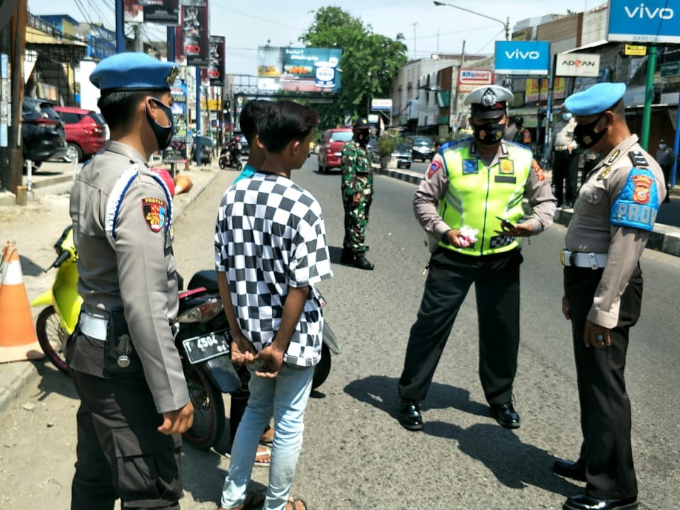 KARAWANG- Upaya pencegahan Covid-19 Polsek Karawang Kota gelar operasi yustisi gabungan terkait kedisiplinan masyarakat menggunakan masker, Minggu (4/10/20).