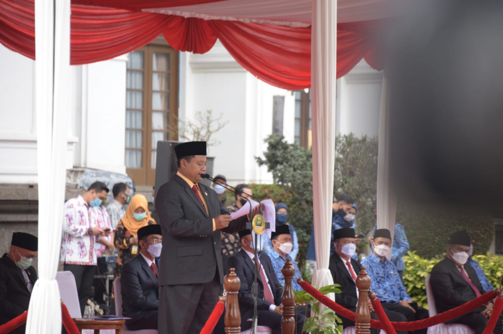 BANDUNG – Wakil Gubernur (Wagub) Jawa Barat (Jabar) Uu Ruzhanul Ulum menjadi Inspektur Upacara Hari Bakti Pekerjaan Umum (PU) ke-75 Tingkat Provinsi Jabar Tahun 2020 di Gedung Sate, Kota Bandung, Kamis (3/12/2020).
