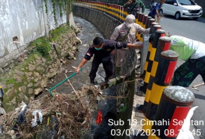 Cimahi,- Satgas Subsektor 13 Cimahi Selatan memulai kegiatannya dengan berpatroli di bantaran sungai Cimahi, Cikendal, Cibaligo, Cibabat dan Ciujung, hari Minggu, 3/1/2021).