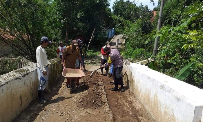 Kebersamaan yang dibangun oleh Polri dan warganya ditunjukkan oleh Bhabinkamtibmas Polsek Kasokandel Polres Majalengka dengan warga Desa Wanajaya saat melaksanakan gotong royong dalam memperbaiki jembatan saluran air, selasa (5/1/2021).