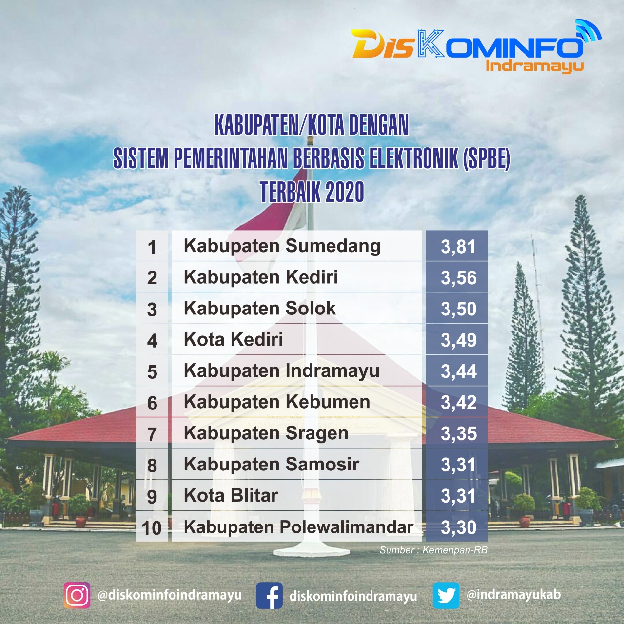 Sementara itu secara lengkap berdasarkan hasil evaluasi KEMENPANRB, 10 kabupaten/kota dengan SPBE terbaik 2020 yakni Kabupaten Sumedang (3,81), Kabupaten Kediri (3,56), Kabupaten Solok (3,50), Kota Kediri (3,49), Kabupaten Indramayu (3,44), Kabupaten Sragen (3,35), Kabupaten Samosir (3,31), Kota Blitar (3,31), dan Kabupaten Polewalimandar (3,30).