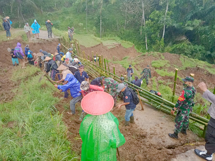 KAB. KUNINGAN – Karya Bhakti Kodim 0615/ Kuningan bersama warga masyarakat mewarnai peringatan HUT TNI ke 75 melalui giat gotong- royong memperbaiki tanah longsor yang menutup badan jalan di desa Jatisari teoatnta di dusun Pahing RT 08 RW 03 blok Cibahu desa Jatisari kec Subang, Senin (5/10/2020).