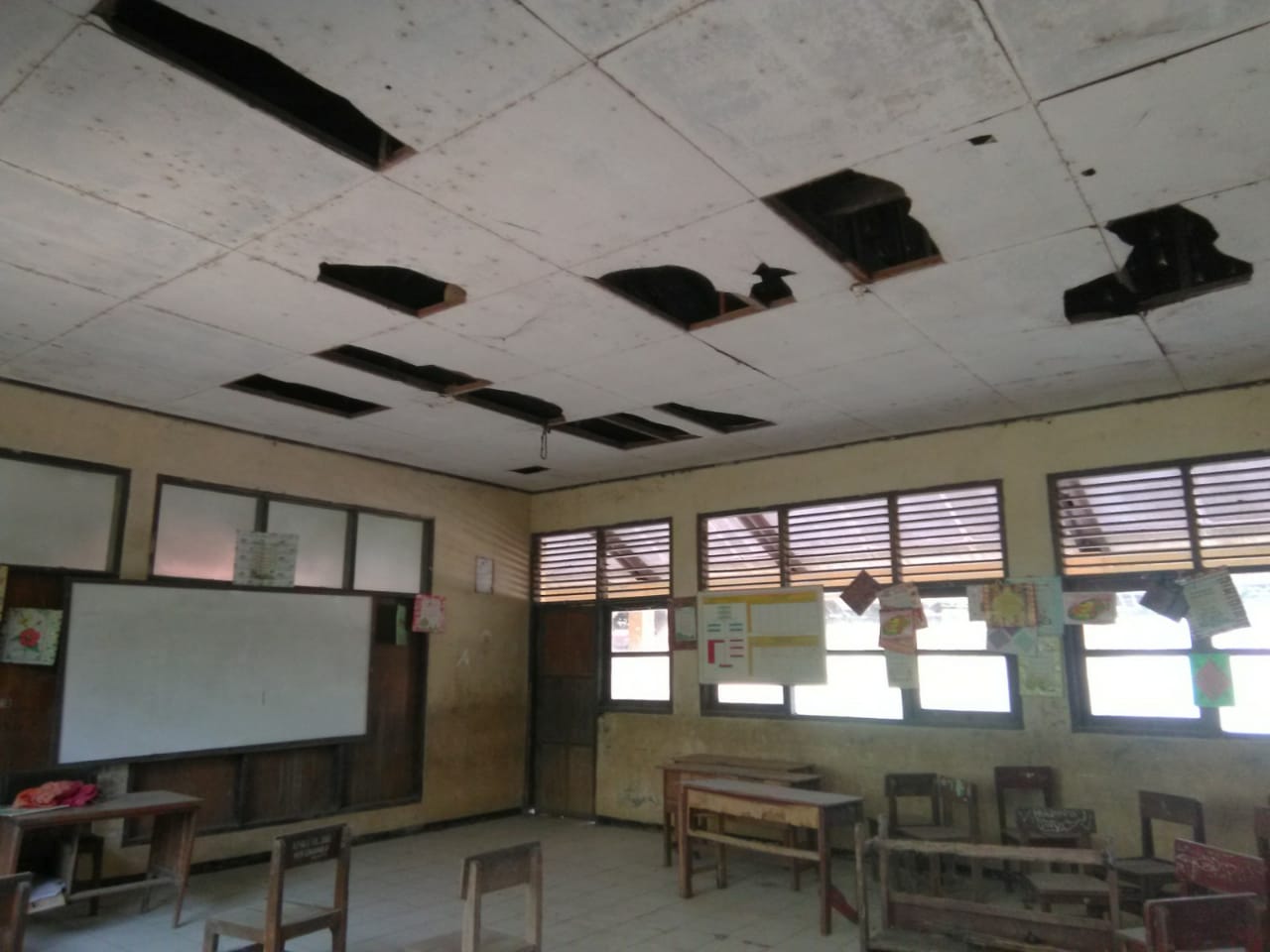 Ketujuh ruangan tersebut plafondnya banyak yang sudah jatuh dari tempatnya. Ada beberapa ruang kelas bolong kacanya. Hal tersebut tentu sangat membahayakan terlebih menjelang musim penghujan.