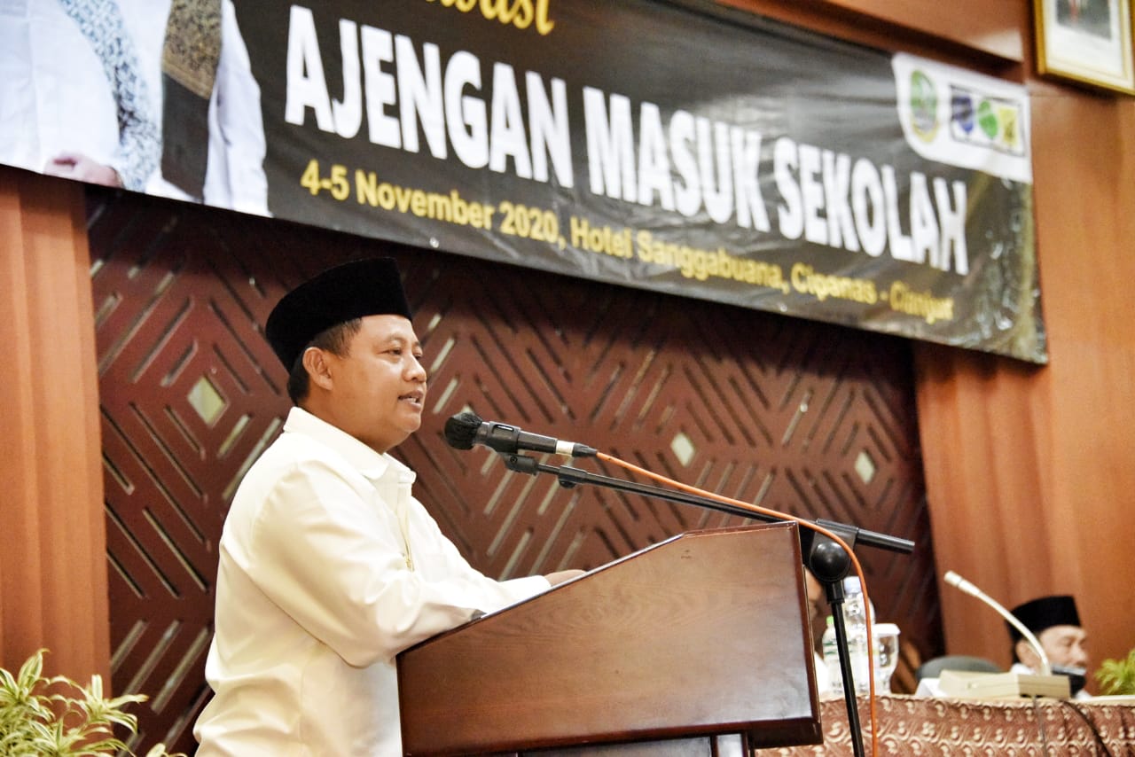 CIANJUR – Wakil Gubernur (Wagub) Jawa Barat (Jabar) Uu Ruzhanul Ulum membuka kegiatan sosialisasi Ajengan Masuk Sekolah (AMS) di Hotel Sanggabuana, Kabupaten Cianjur, Rabu (4/11/2020).