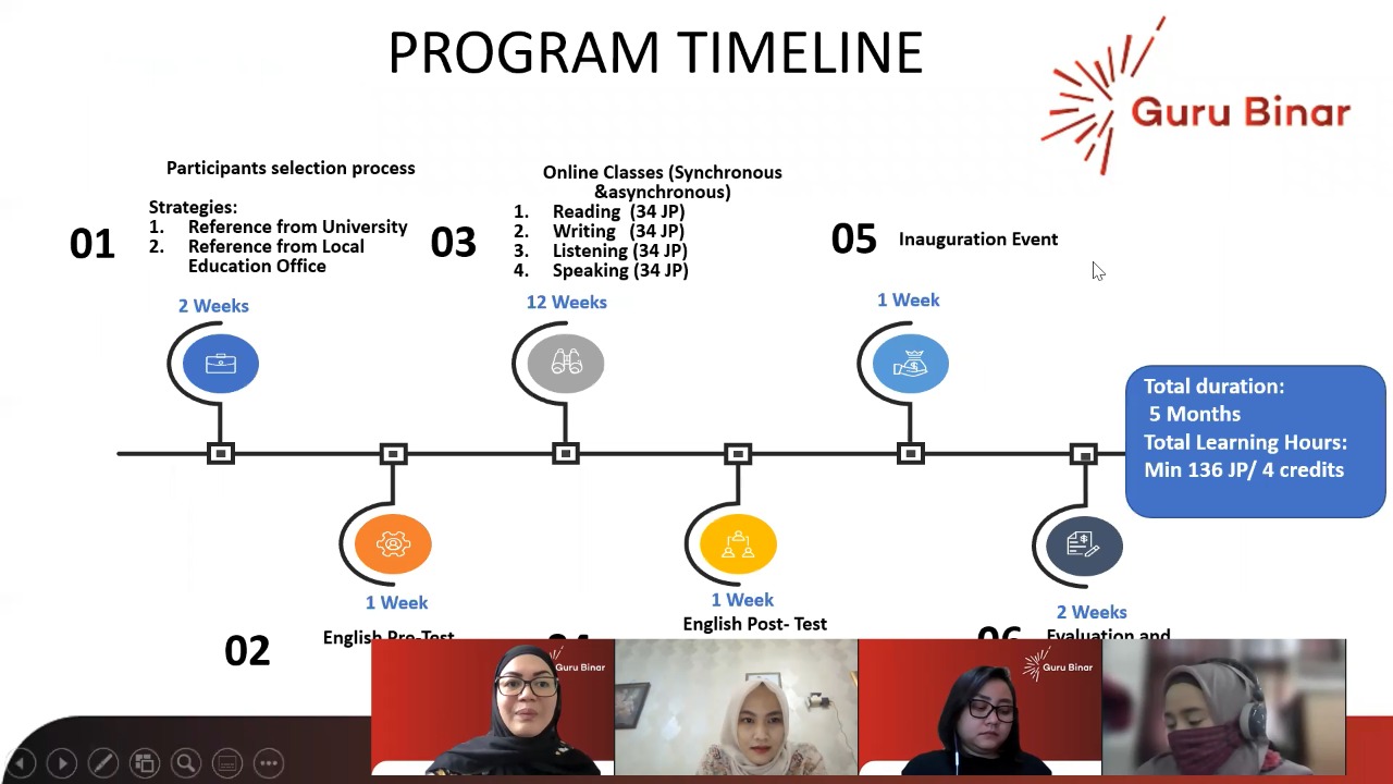 Program ini akan diawali dengan proses seleksi yang dimulai sejak bulan September 2021. Selanjutnya para peserta program akan mengikuti kelas pelatihan yang menggabungkan pendekatan synchronous dan asynchronous melalui platform pelatihan daring Guru Binar dan Cakap dengan menyasar pada empat keterampilan (reading, writing, speaking, dan listening).
