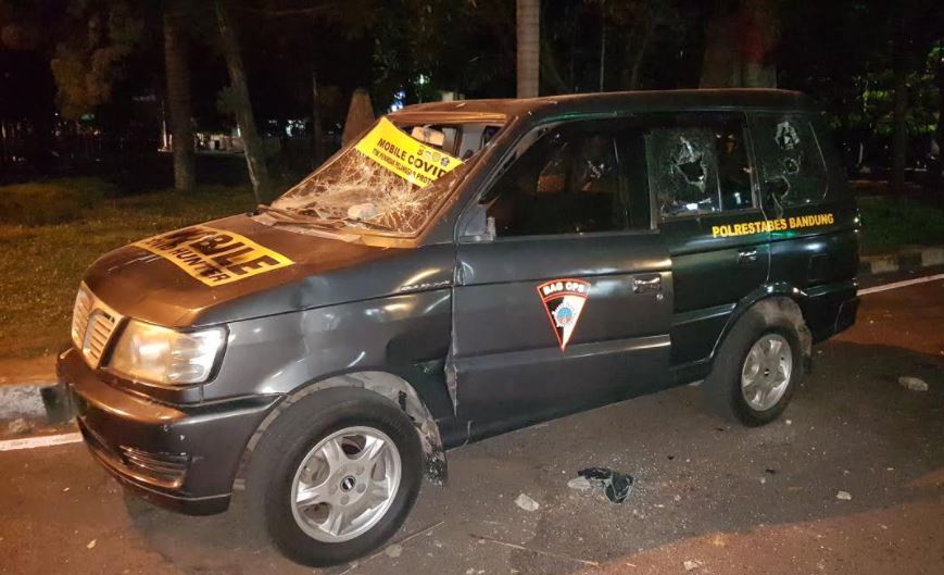 BANDUNG — Massa yang melakukan unjuk rasa menuntut pembatalan Omnibuslaw UU Cipta Lapangan Kerja di depan Kantor DPRD Provinsi Jawa Barat merusak mobil operasional Polrestabes Bandung.