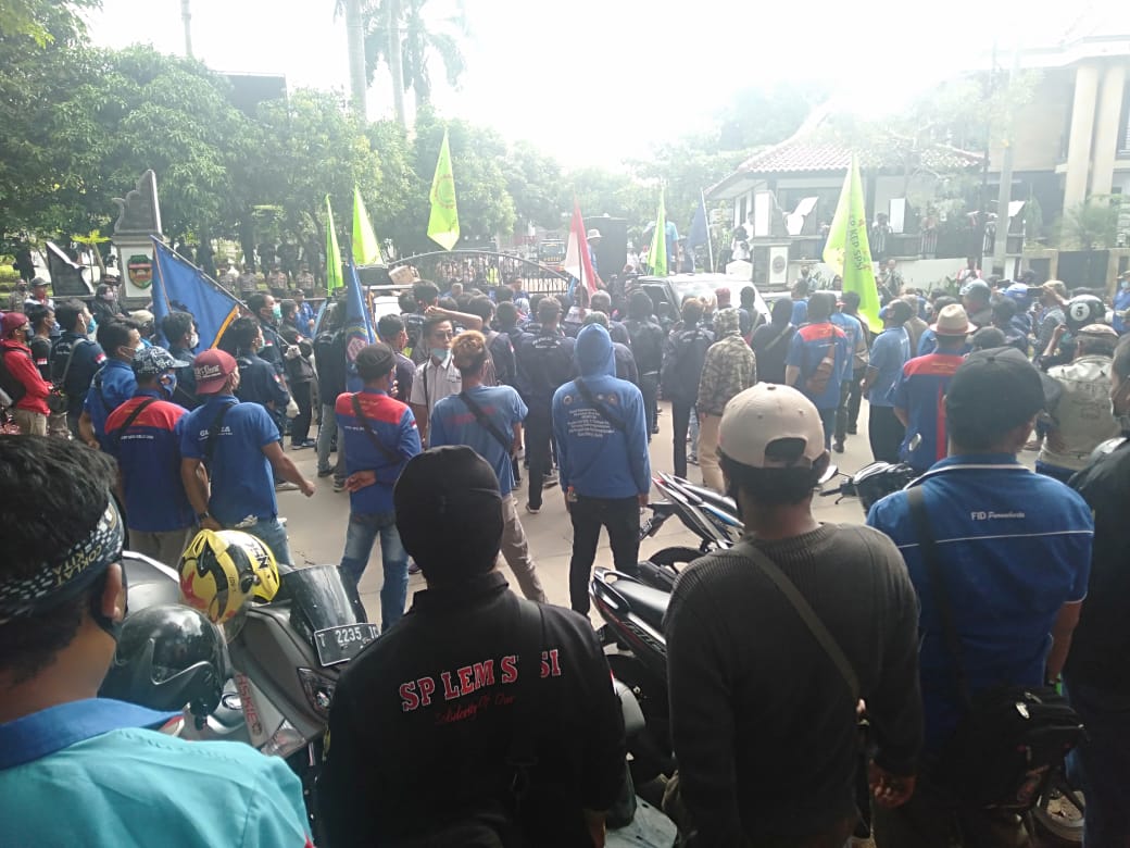 PURWAKARTA – Ribuan buruh di Kabupaten Purwakarta lakukan aksi demonstrasi di depan kantor Pemerintah Kabupaten (Pemkab) Purwakarta dan DPRD Purwakarta, Selasa (6/10) siang. Aksi ini dilakukan dalam rangka menolak UU Cipta Kerja karena dinilai bakal merugikan buruh.