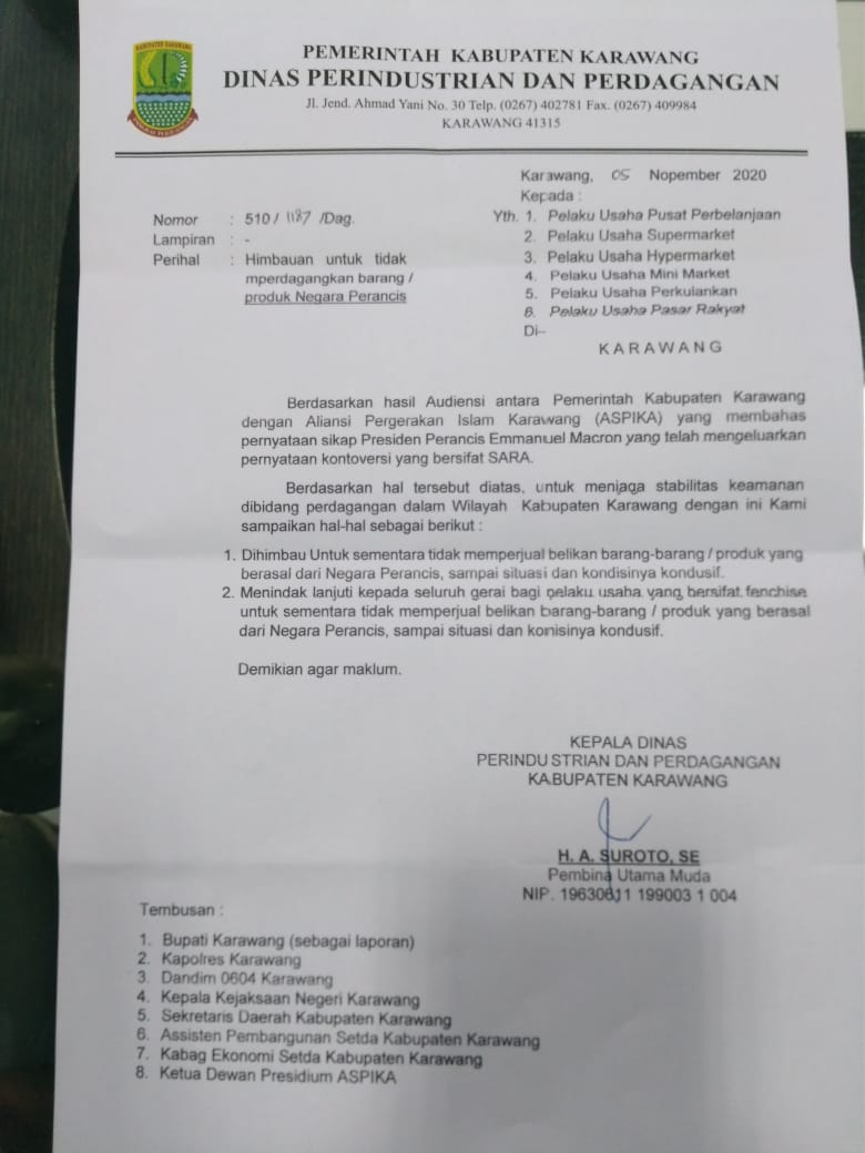 Menanggapi hal tersebut, Kepala Dinas Perindustrian dan Perdagangan (Disperindag) Kabupaten Karawang, Ahmad Suroto mengeluarkan surat himbauan untuk memboikot produk Perancis.