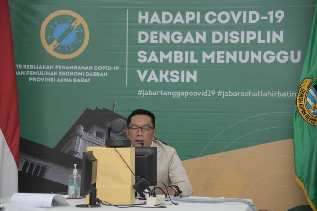 Gubernur Jabar Ridwan Kamil mengikuti Rapat Persiapan Tahap Pertama Pengoperasian Pelabuhan Patimban bersama Menteri Perhubungan Republik Indonesia melalui konferensi video dari Gedung Pakuan, Kota Bandung, Kamis (5/11/2020). (Foto: Rizal/Humas Jabar)