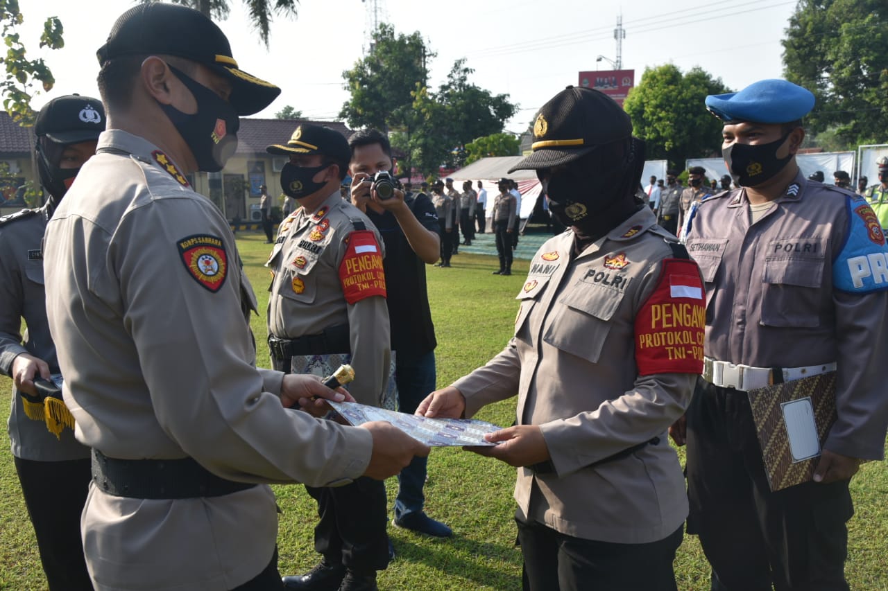 Kapolresta Cirebon, Kombes Pol M. Syahduddi, S.I.K.,M.Si., memimpin upacara Korp Raport Kenaikan Pangkat Pengabdian di Mapolresta Cirebon, Senin (7/9/2020). Sebanyak lima personel Polresta Cirebon dan Polsek jajaran dinaikkan pangkatnya satu tingkat lebih tinggi dari sebelumnya.