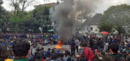 Ribuan Mahasiswa tampak memadati ruas jalan menolak UU Cipta Kerja yang telah disahkan oleh DPR- RI serta di warnai aksi bakar ban. Sansan Redy Taufik Koordinator aksi yang juga sebagai Ketua Bidang Perguruan Tinggi Kemahasiswaan dan Pemuda HMI Cabang Bandung, mengatakan kita ini sangat keberatan dengan adanya pengesahan UU Cipta Kerja secara keseluruhan tidak secara parsial, ” ucapnya di sela – sela aksi berlangsung.
