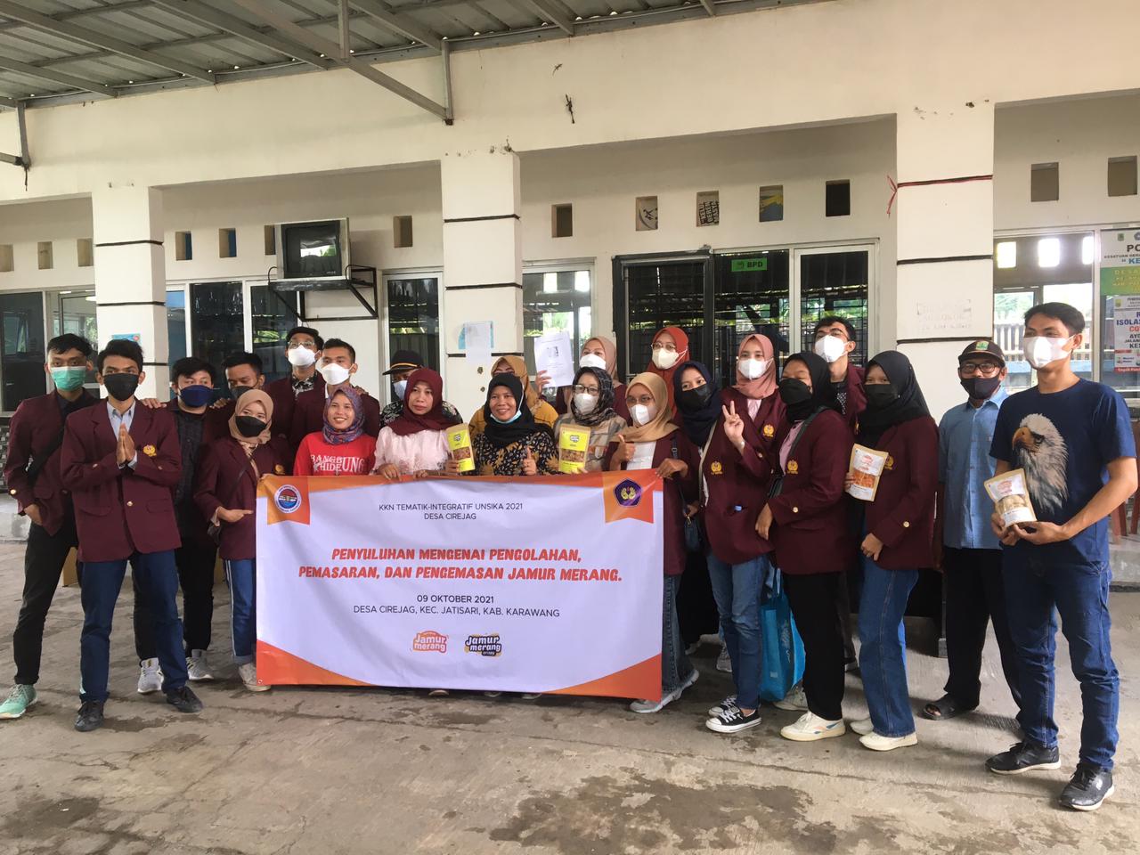 RILIS – Sebanyak 17 mahasiswa Universitas Singaperbangsa Karawang (UNSIKA) melakukan kegiatan Kuliah Kerja Nyata (KKN) Tematik-Integratif di Desa Cirejag, Kecamatan Jatisari, Kabupaten Karawang. Tujuan dari kegiatan ini untuk memberikan bentuk inovasi baru pada pengolahan pangan dan kemasan yang dapat meningkatkan nilai pendapatan ekonomi masyarakat. Kegiatan ini berjalan ditengah kondisi pandemi Covid-19 dan dilaksanakan secara semi daring dengan mematuhi protokol Kesehatan yang dianjurkan pemerintah. Potensi yang terlihat di desa diantaranya adalah produksi jauur merang; pembuatan kripik sukun; dan pembuatan kripik pisang. Peluang tersebut kami manfaatkan dengan membuat program kegiatan kerja selama menjalankan KKN di Desa Cirejag diantaranya:1)Penyuluhan Pengolahan jamur merang menjadi olahan makanan yang mampu bersaing di pasaran;2)Penyuluhan Pengemasan olahan makanan jamur merang yang memiliki nilai jual dan estetika untuk mendukung pemasaran;3)Penyuluhan Edukasi tentang pemasaran olahan makanan jamur merang berbasis pemasaran digital melalui pengenalan sosial media dan e-commerce. Sosialisasi dari program kerja kami mendapatkan antusiasme yang tinggi dari kelompok PKK di desa. Berbagai respon postif dari ibu- ibu kelompok PKK, atas inovasi rasa, tekstur dan kemasan produk olahan krupuk jamur dan jamur crispy yang telah kami buat. Hasil dari karya inovasi KKN kami dapat diakses juga di akun instagram https://www.instagram.com/kkndesacirejag/. (rls)