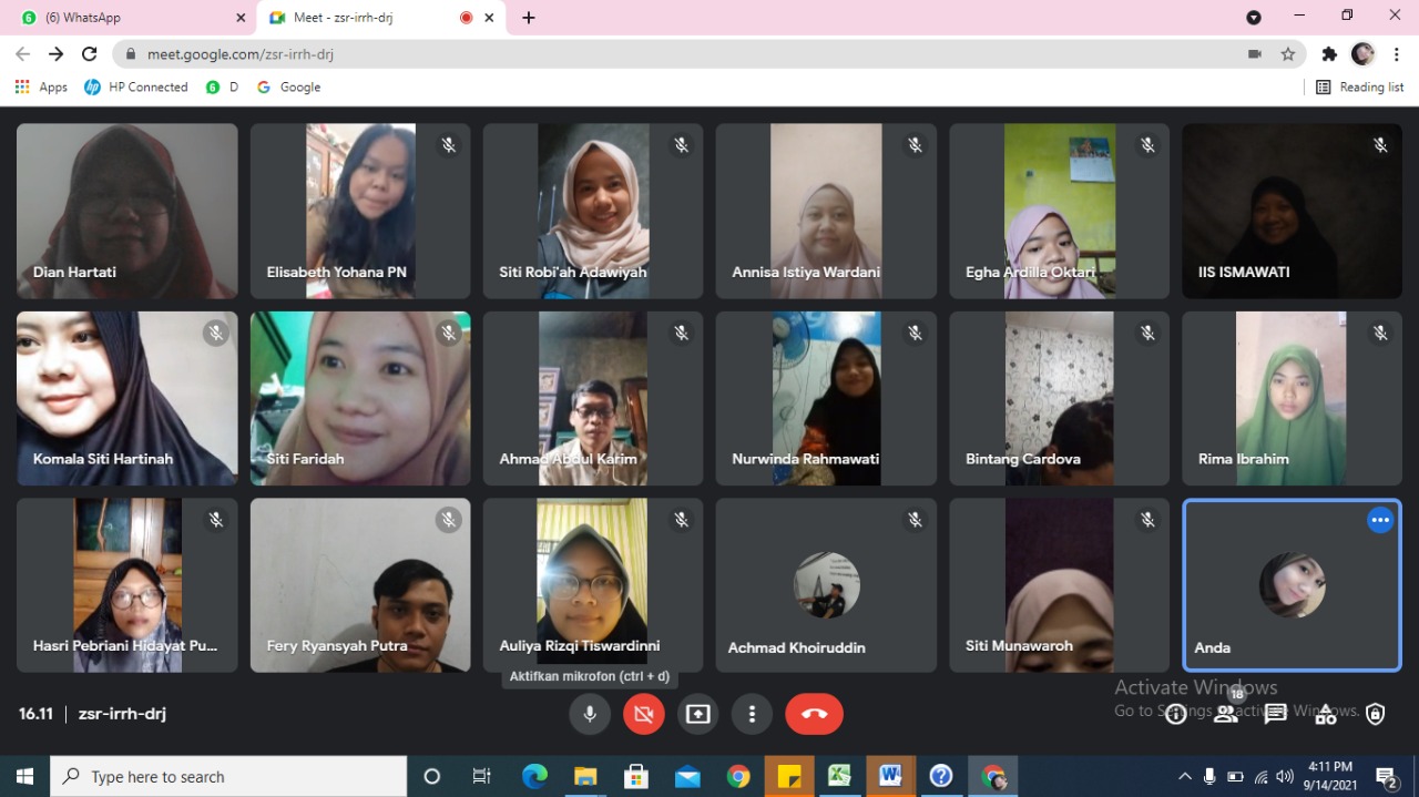 Diskusi dilakukan secara daring mengingat situasi masih belum aman dari bahaya Covid-19. Maka mahasiswa KKN menggunakan aplikasi Google Meet dan Zoom Meeting untuk memudahkan berkomunikasi dengan anggota KKN. Yang dibicarakan tentang bagaimana melaksanakan program kerja mengalihwahanakan cerita pendek kedalam media interaktif.
