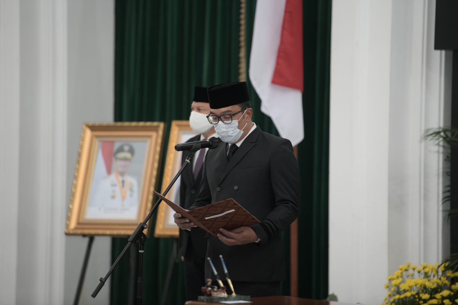 Gubernur Jawa Barat Ridwan Kamil saat melantik 480 PNS untuk pengawas, guru, dan kepala sekolah di Gedung Sate, Kota Bandung, Senin (6/12/2021).