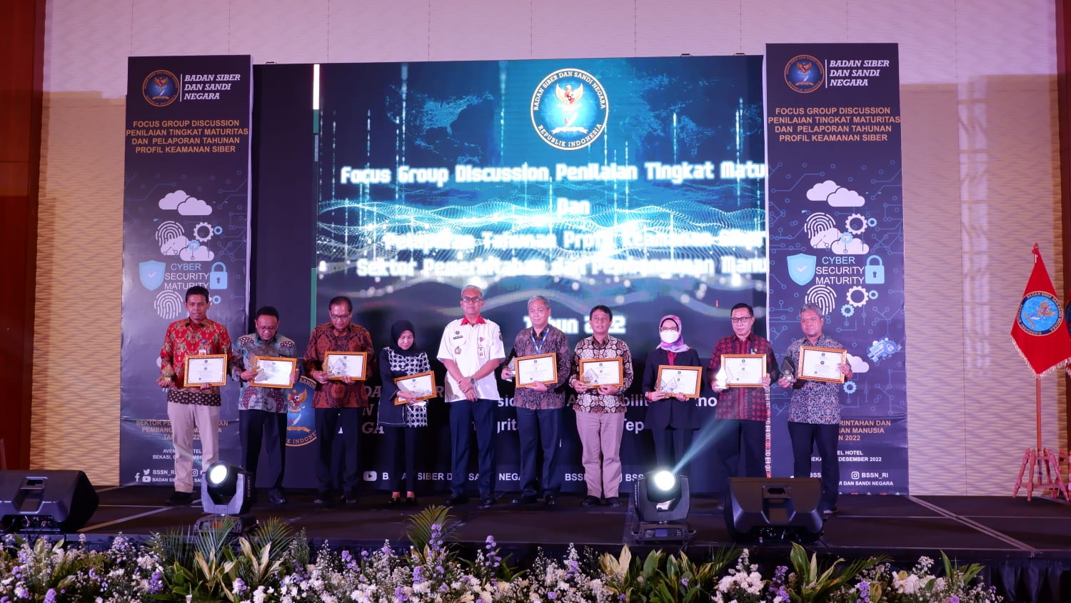 Pemda Provinsi Jawa Barat menerima penghargaan dari Badan Siber dan Sandi Negara (BSSN) dalam Focus Group Discussion Penilaian Tingkat Maturitas dan Pelaporan Tahunan Profil Keamanan Siber Sektor Pemerintahan dan Pembangunan Manusia Tahun 2022 di Avenzel Hotel dan Convention Cibubur, Kota Bekasi, Selasa (6/12/2022).