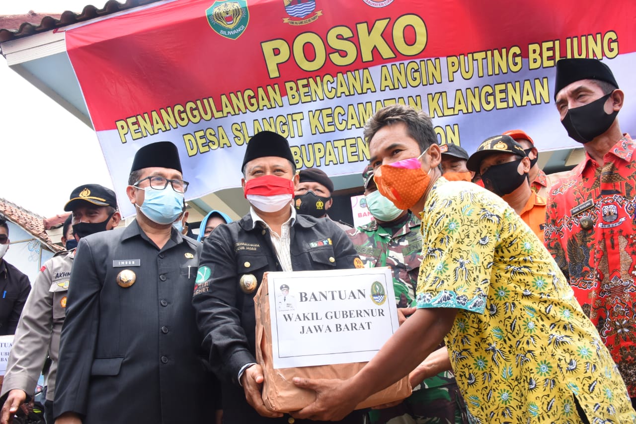 KAB. CIREBON — Wakil Gubernur Jawa Barat (Jabar) Uu Ruzhanul Ulum menyerahkan bantuan berupa sembako kepada warga terdampak bencana angin puting beliung di Desa Slangit, Kabupaten Cirebon, Kamis (7/1/2021).
