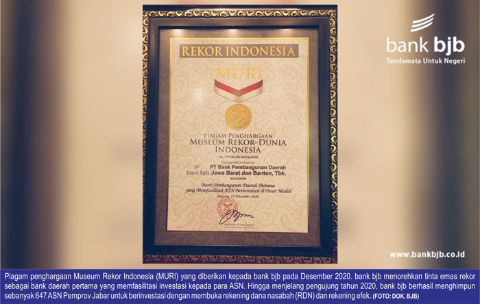 Senior Manager Museum Rekor Indonesia Yusuf Ngadri mengapresiasi langkah proaktif bank bjb dalam mengajak para ASN untuk berinvestasi di pasar modal. MURI mendaulat bank bjb sebagai bank pembangunan daerah pertama yang memfasilitasi ASN untuk berinvestasi di pasar modal berkat semangat inovasi dan kolaborasi dari perseroan.