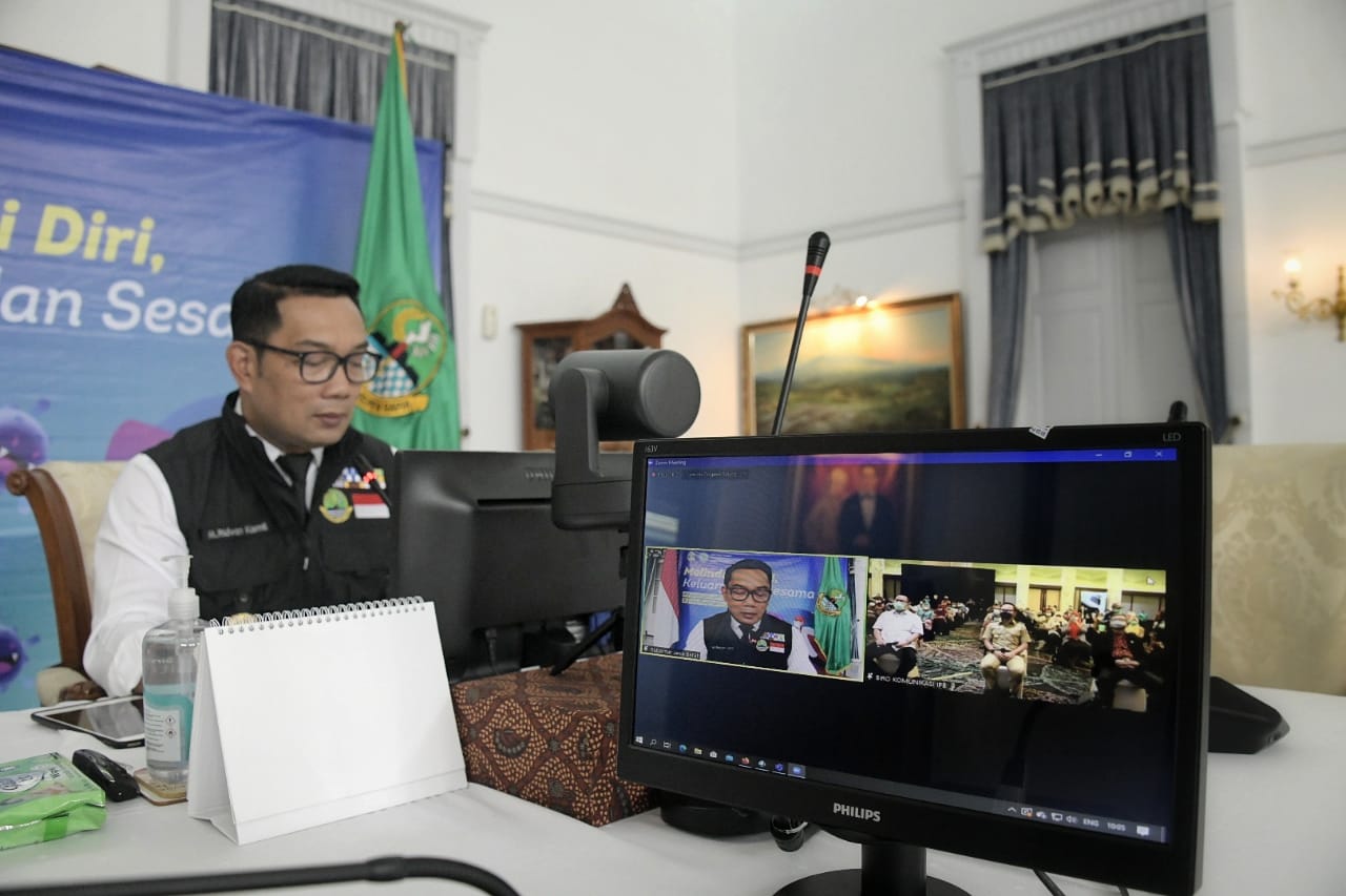 Gubernur Jawa Barat (Jabar) Ridwan Kamil turut menyaksikan vaksinasi sekaligus memberikan sambutan via konferensi video dari Gedung Pakuan, Kota Bandung.
