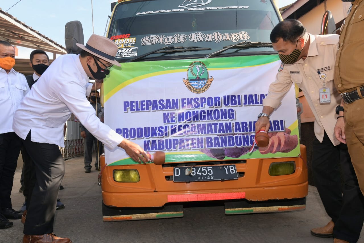 KAB. BANDUNG, — Gubernur Jawa Barat (Jabar) Ridwan Kamil melepas 30 ton ubi jalar (Ipomea batatas L.) produksi petani Desa Pinggirsari, Kecamatan Arjasari, Kabupaten Bandung, untuk di ekspor ke Hong Kong, dalam acara pelepasan di halaman Kantor Desa Pinggirsari, Selasa (8/9/2020).