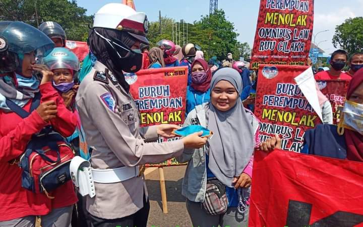 ”Secara humanis kami membagikan masker kepada pengunjuk rasa yang berorasi dijalan raya dan di sekitar Pemda Karawang, sembari sesekali mengimbau mereka agar tidak melakukan aksi anarkis dan tetap jalankan protokol kesehatan,” ujar AKP Iis Puspita SH.MH., Kasat Binmas yang juga merupakan senior Polwan Polres Karawang.