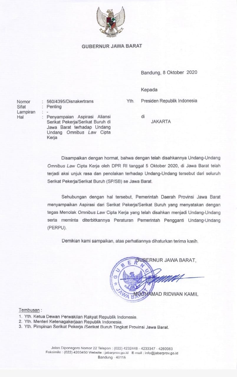 KOTA BANDUNG, – Setelah Bupati Bandung, H. Dadang M. Naser, memberikan dukungan kepada kaum buruh dengan melayangkan surat aspirasi serikat pekerja untuk menolak pengesahan UU Omnibus Law ke DPR RI, Rabu kemarin (7/10/2020), hari ini Kamis (08/10/20) giliran orang nomor 1 di Jawa Barat, Ridwan Kamil menyusul surat aspirasi penolakan pengesahan kepada pusat.
