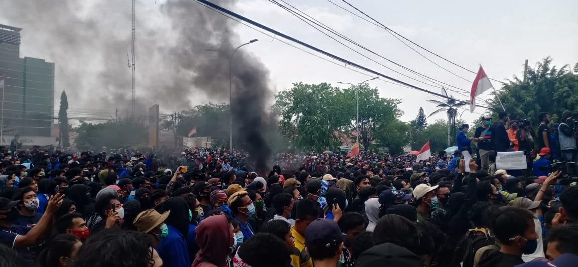 Para mahasiswa juga membakar ban menandakan simbol perlawanan terhadap penguasa yang telah melukai hati rakyat dengan mengesahkannya UU Cipta Lapangan Kerja.