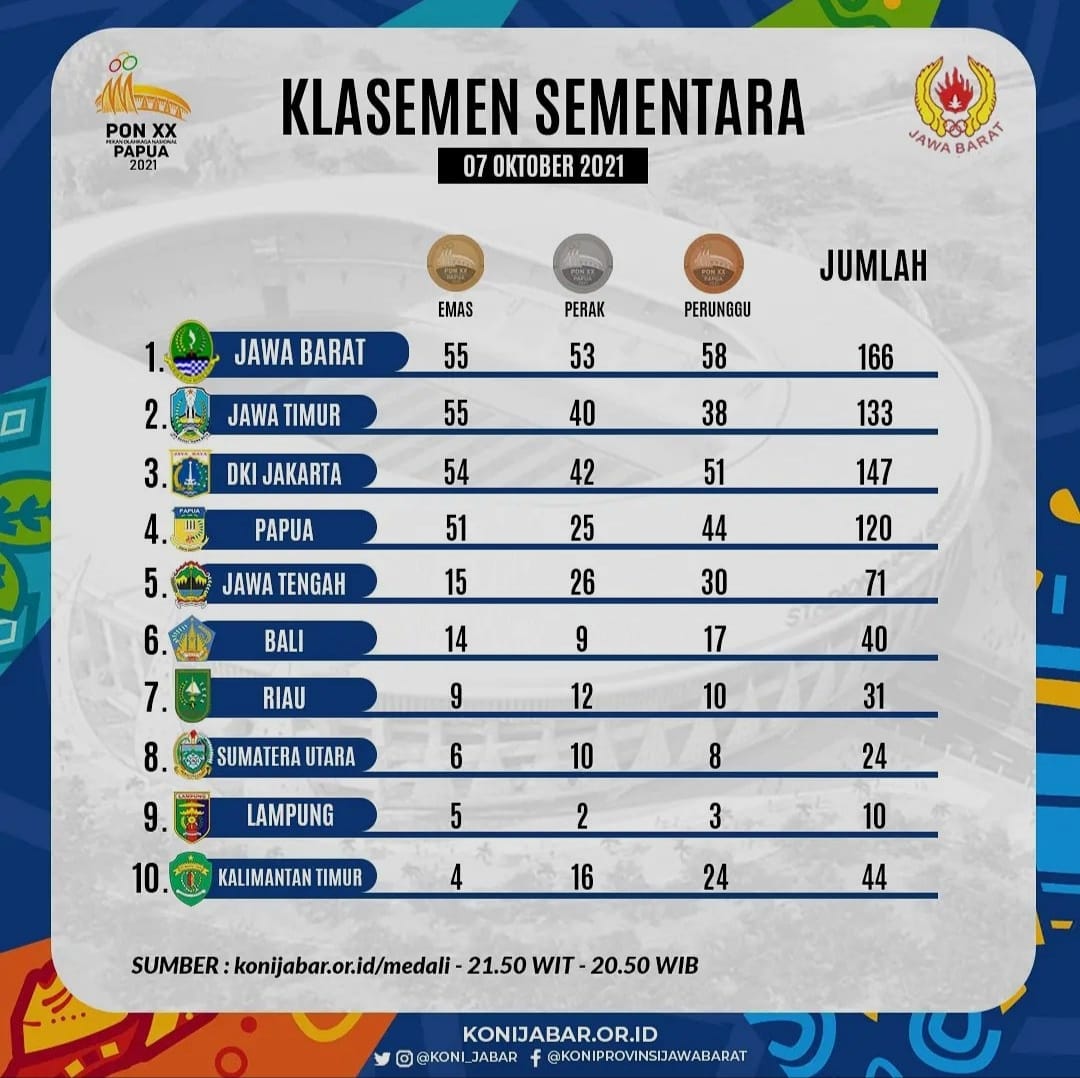 BANDUNG – Provinsi Jawa Barat (Jabar) menjadi pemuncak klasemen sementara perolehan medali Pekan Olahraga Nasional (PON) XX Papua 2021 usai menyalip perolehan medali DKI Jakarta dan Papua.