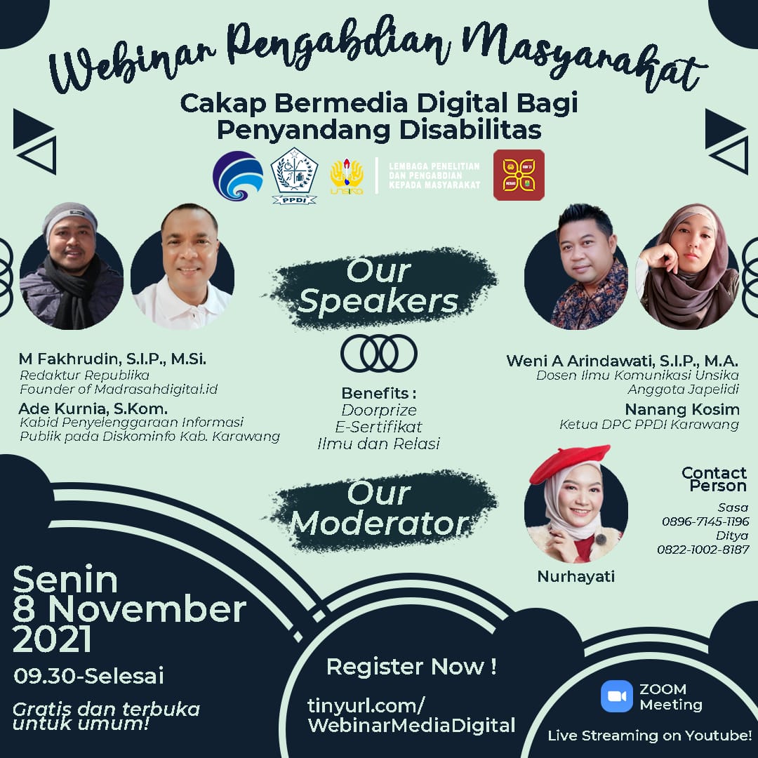 KARAWANG-Pengabdian masyarakat yang diimplementasikan dalam Kuliah Kerja Nyata (KKN) Universitas Singaperbangsa Karawang (UNSIKA) diselenggarakan secara virtual pada hari Senin, 8 November 2021. Dengan mengusung tema cakap bermedia digital bagi penyandang disabilitas. Menghadirkan 4 narasumber yang ahli di bidang komunikasi , teknologi dan informasi diantaranya pemateri pertama Dosen Ilmu komunikasi Unsika, Weni Arindawati S.IP..M,Si, pemateri ke 2 Nanang Kosim selaku Ketua Perkumpulan Penyandang Disabilitas Indonesia (PPDI) cabang Karawang, pemateri ke 3 Muhammad Fakhruddin selaku redaktur harian umum Republika dan pemateri ke 4 Ade Kurnia perwakilan Dinas komunikasi dan informatika kabupaten Karawang.