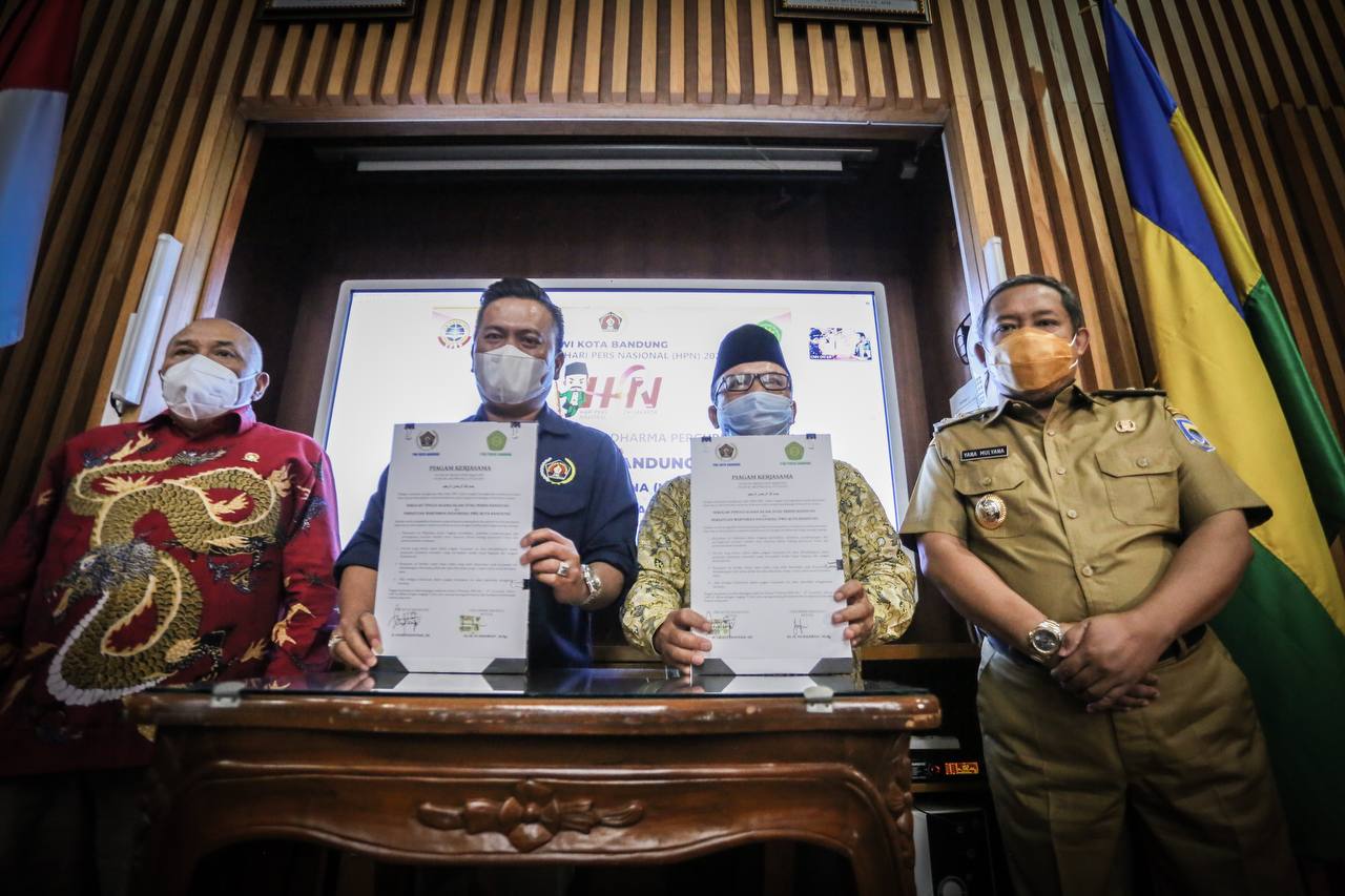 BANDUNG – Pada peringatan Hari Pers Nasional (HPN) Tahun 2021 tingkat Kota Bandung dilaksanakan penandatangan perjanjian kerjasama atau Memorandum Of Understanding (MoU) Tri Dharma Perguruan Tinggi antara Persatuan Wartawan Indonesia (PWI) Kota Bandung bersama Universitas Sangga Buana (USB) YPKP serta Sekolah Tinggi Agama Islam Persatuan Islam (STAIPI) Bandung yang disaksikan langsung Wakil Walikota Bandung, Yana Mulyana serta Wakil Ketua DPRD Kota Bandung, Ade Supriadi di Balaikota, Bandung, Selasa (9/2/2021).