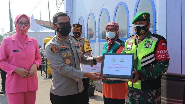 CILEUNYI – Sebagai bentuk perhatian pimpinan kepada petugas pengamanan Lebaran 2021, Kapolresta Bandung Kombes Pol Hendra Kurniawan bersama Ketua Bhayangkari Cabang Kota Bandung Ny. Rina Hendra Kurniawan memberikan bingkisan di Pos Pelayanan Lebaran 2021 di Cileunyi, Kabupaten Bandung, Jawa Barat. Jumat, (7/5/2021).