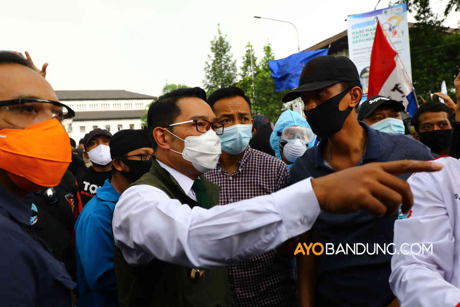 BANDUNG — Gubernur Jawa Barat Ridwan Kamil menemui 10 perwakilan pengunjuk rasa yang melakukan demonstrasi penolakan UU Cipta Kerja di depan Gedung Sate Kota Bandung, Kamis (8/10/2020).