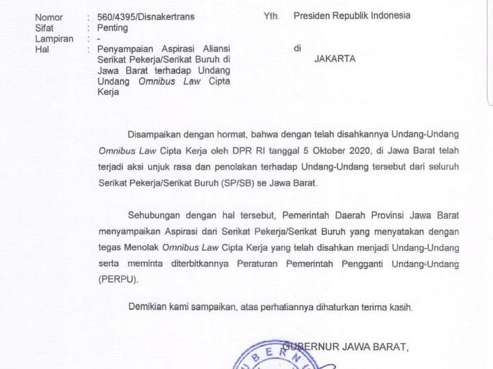 Surat itu ditandatangani Gubernur Jawa Barat Ridwan Kamil. Dalam surat bernomor 560/4395D/Disnakertrans tertanggal 8 Oktober 2020 itu, Ridwan Kamil menyampaikan bahwa pengesahan Omnibus Law UU Cipta Kerja oleh DPR RI pada 5 Oktober 2020 kemarin mendapatkan penolakan dari serikat pekerja atau buruh se Jawa Barat.