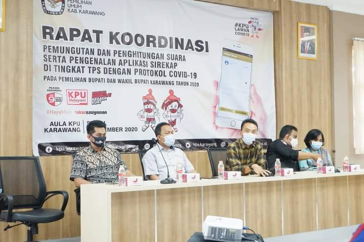 KARAWANG– Komisi Pemilihan Umum (KPU) Kabupaten Karawang menggelar Rapat Koordinasi (Rakor) Pemungutan dan Penghitungan Suara serta Pengenalan Aplikasi Sirekap pada Pemilihan Bupati dan Wakil Bupati Karawang Tahun 2020 dengan Protokol Covid-19, Sabtu (07/11).