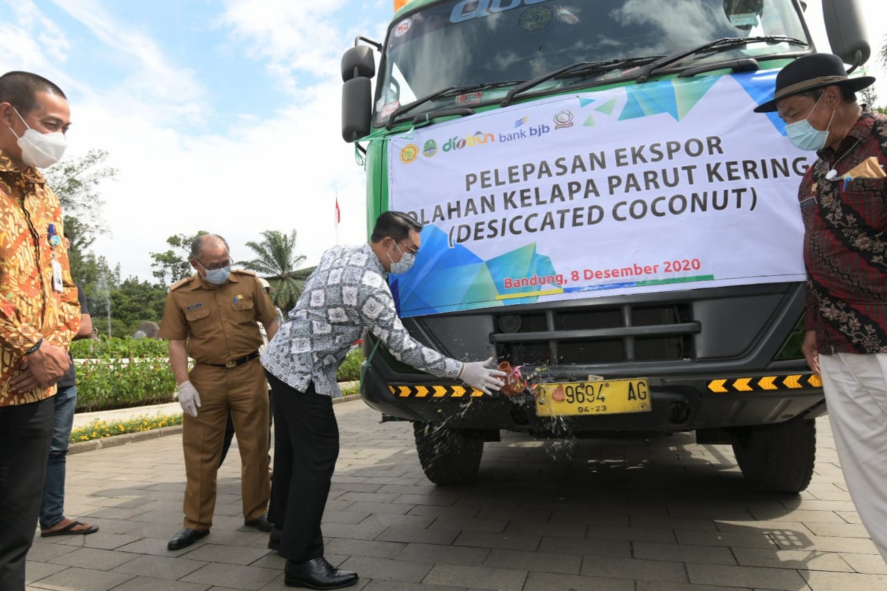 BANDUNG – Gubernur Jawa Barat Ridwan Kamil melepas 20 ton kelapa parut kering (desiccated coconut) untuk diekspor ke Arab Saudi dalam acara pelepasan di halaman Gedung Sate, Kota Bandung, Selasa (8/12/2020).