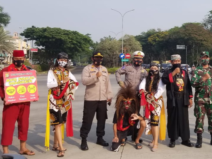 BEKASI- Untuk mendapat atensi lebih dari warga, petugas Polsek Cikarang Pusat sengaja berbusana adat saat membagikan masker di perempatan lampu merah Kota Delta Mas, Desa Hegarmukti Kecamatan Cikarang Pusat, Bekasi, Kamis (10/09/20) pagi.