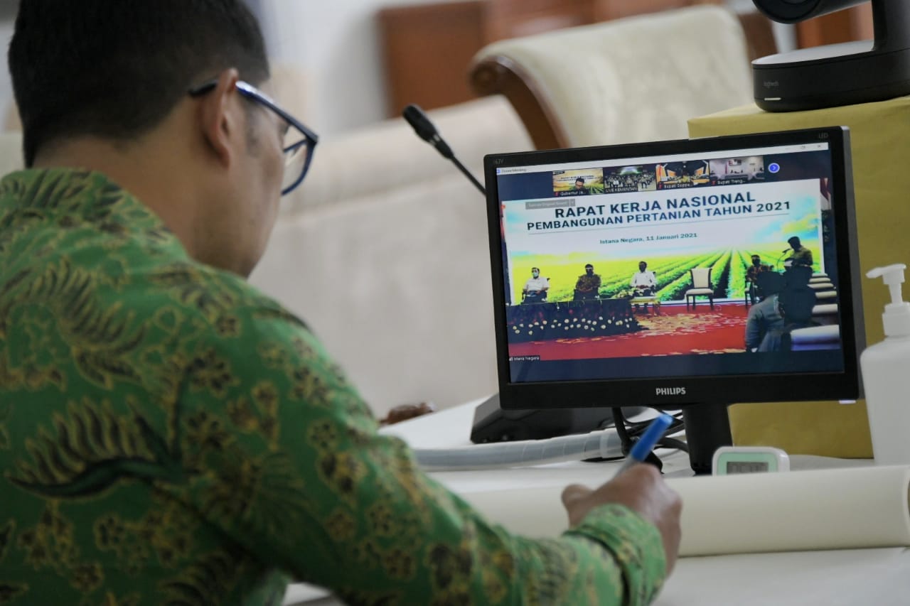 BANDUNG — Gubernur Jawa Barat (Jabar) Ridwan Kamil menghadiri pembukaan “Rapat Kerja Nasional (Rakernas) Pembangunan Pertanian Tahun 2021” bersama Presiden Republik Indonesia (RI) melalui konferensi video dari Gedung Pakuan, Kota Bandung, Senin (11/1/2021).