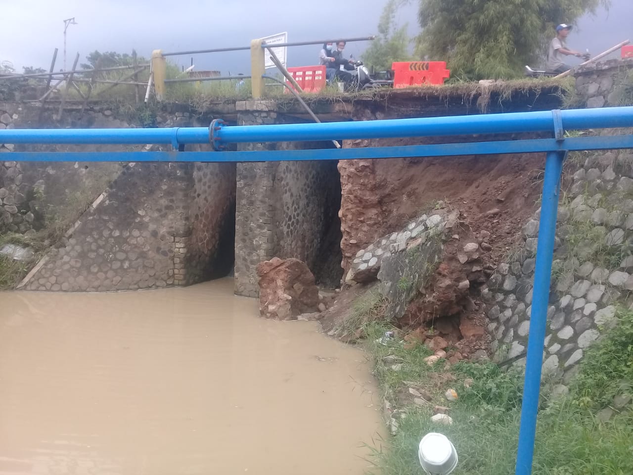 Menurut Rohman (56) warga sekitar memberikan keterangan bahwa dinding jembatan longsor, akibat intensitas curah hujan tinggi.