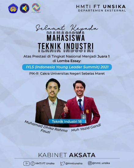 Kegiatan lomba esai IYLS 2021 bertema “Menghadapi Kesehatan Mental pada Remaja Akibat Pola Hidup Selama Pandemi’’ diselenggarakan oleh Kelompok Mahasiswa Pusat Informasi dan Konseling Remaja (PIK-R) Cakra yang berasal dari Universitas Sebelas Maret (UNS). Tim mahasiswa Unsika diketuai oleh Muh. Yazid Gandi dengan anggota, Muhamad Dhika Rahma Fauzi, menggagas ide yang berjudul “Penerapan Program Kesehatan Mental Berbasis Aplikasi GO – SENTRAL pada Siswa SMA Sederajat Melalui Siklus PDCA di Masa Pandemi Covid – 19’’.